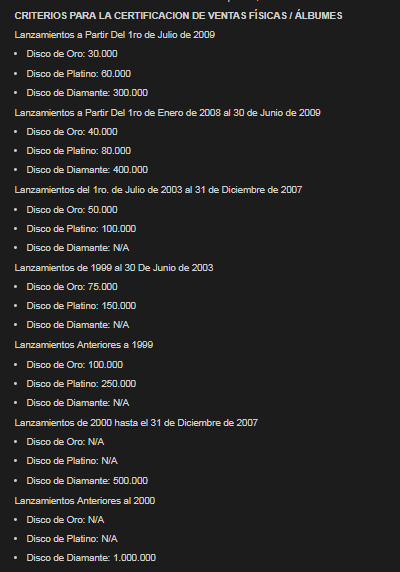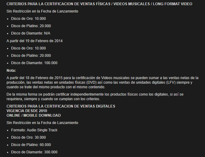 Os critérios de certificação de álbuns, vídeos, ringtones e singles pela AMPROFON variam de acordo com o ano de lançamento da produção discográfica.