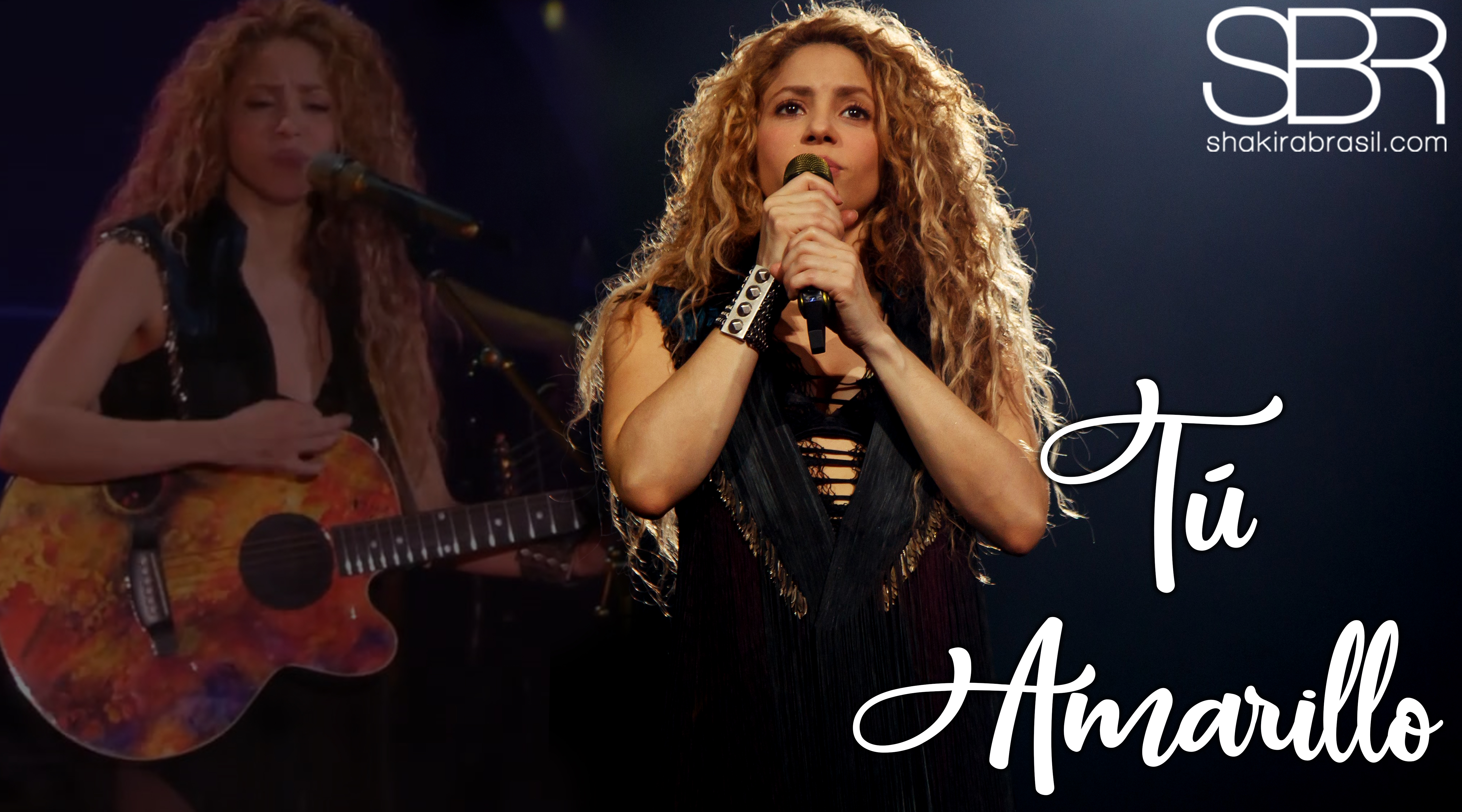 Aqui Shakira usa um vestido transpassado dourado, feito pelo designer colombiano Juan Carlos Obando especialmente para que ela possa removê-lo com facilidade.