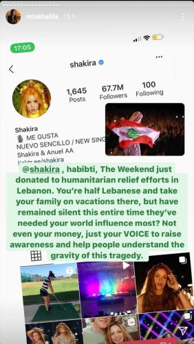 “Amada Shakira, o The Weekend acabou de doar para os esforços de ajuda humanitária no Líbano. Você é metade libanesa e passa férias em família lá. mas você permaneceu em silêncio esse tempo todo, no momento em que eles mais precisavam da sua influência mundial? Nem mesmo seu dinheiro, apenas sua voz para aumentar a conscientização e ajudar as pessoas a compreender a gravidade desta tragédia.”, escreveu Mia em sua postagem e ilustrando com um print de tela do perfil da estrela latina no Instagram.